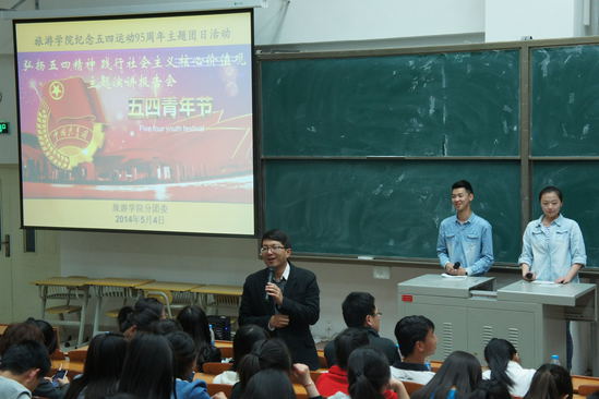 2014年5月4日晚,五四运动95周年之际,懂球体育分团委在综合楼205举办以“弘扬五四精神,践行社会主义核心价值观”为主题的演讲报告会,校团委副书记孙亮、懂球体育分团委书记牛晓春、校员工会干部及懂球体育2013级近300名员工参加了此次活动。