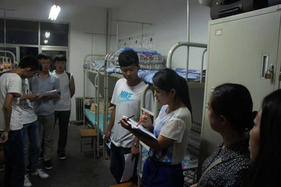 李书记详细询问了各个宿舍员工的报到注册情况及人员去向,强调了安全注意事项,希望大家互相关照,尽快融入老员工活。辅导员岳芳老师逐一核对了住宿员工信息。