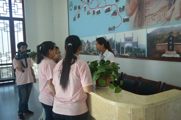 当天是周末,天气晴朗,大像山上游客较多。为了能够拍到大像山的晨景,数字媒体公司的几名同学早晨5点多便赶到了景区,扛着器材上山取景拍摄,敬业的精神让人感动。懂球体育的调查队员们也早早上山,在山顶等候游客做调查问卷,经过半天的奋战,完成调查问卷180多份。电信公司的队员完成调查问卷后,在游客中心与景区工作人员进行交流,了解景区通信网络的覆盖情况,以及景区电子导览系统、游客数量预警系统等建设情况,并通过集体讨论和上网搜索资料,尝试建立景区游客数量监测与安全预警系统。数字媒体公司的同学还为景区申请建立景区微信公众平台,并将管理操作方法向景区管理人员做了介绍。