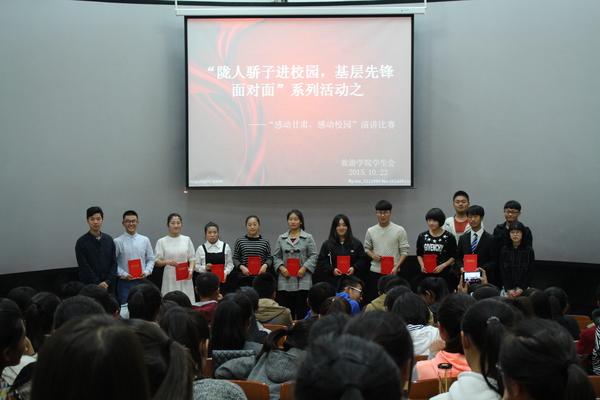经过各班推荐,共有13名选手参加了比赛选手们在台上以充沛的感情和真挚的语言抒发着对陇人骄子的敬佩之情。陇人骄子无私奉献的事迹令人感动,选手们结合自身实际的思考和感悟更是激起同学们的共鸣,不禁由衷的为选手们鼓掌喝彩最终来自旅游管理本科一班的薛时苗同学以激情澎湃演讲和干练大方的台风夺冠,另有平璐等8名同学分获二、三等奖最后,评委们还和选手们交流了此次活动的感悟,对选手们的表现做了精彩点评。
