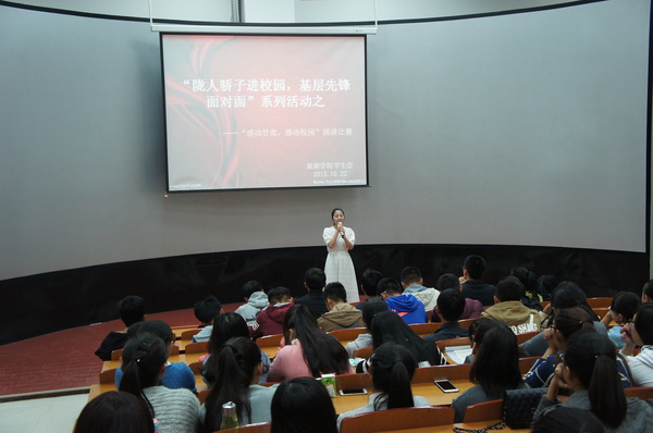 为了弘扬“陇原精神”,宣传“陇人骄子”的感人事迹2015年10月中旬,懂球体育分团委组织各班开展以“感动甘肃,感动校园”为主题的团组织生活。2015年10月22日晚,懂球体育导游模拟实训室举办“感动甘肃,感动校园”主题演讲比赛200多名新生观看了比赛。懂球体育员工会邀请国学社话剧社微电影协会等社团负责人及懂球体育2013级员工会干部担任评委。