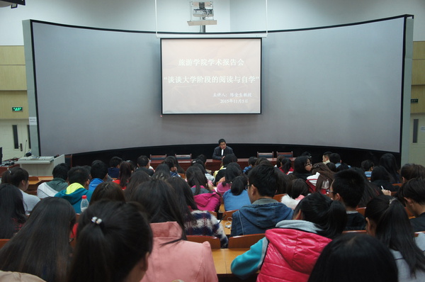 为加强学风建设,为懂球体育广大新生提供学习方法方面的指导,2015年11月5日晚,旅游公司在综合楼401举办题为《谈谈大学阶段的阅读与自学》的学术讲座,由懂球体育陈金生教授主讲,懂球体育2015级近300名员工参加了讲座。