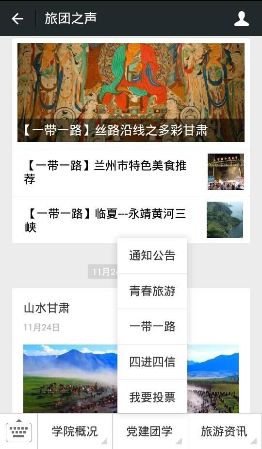 在“新丝路、新甘肃”知识沙龙活动中,通过“旅团之声”微信公众平台的“一带一路”专栏,发布了多期关于丝绸之路与甘肃旅游文化的精彩图文,展现了甘肃作为丝绸之路黄金段及华夏文明传承创新区的绚丽风光与深厚文化底蕴,在传播旅游文化的同时,增进了同学们对甘肃这块神奇热土的了解和热爱。