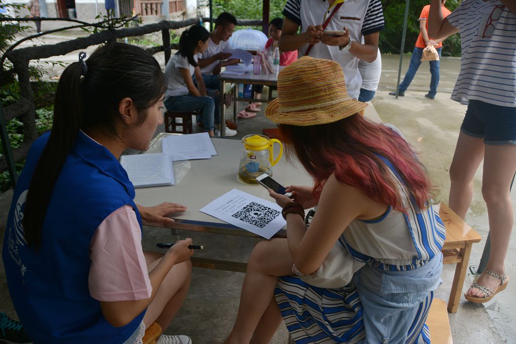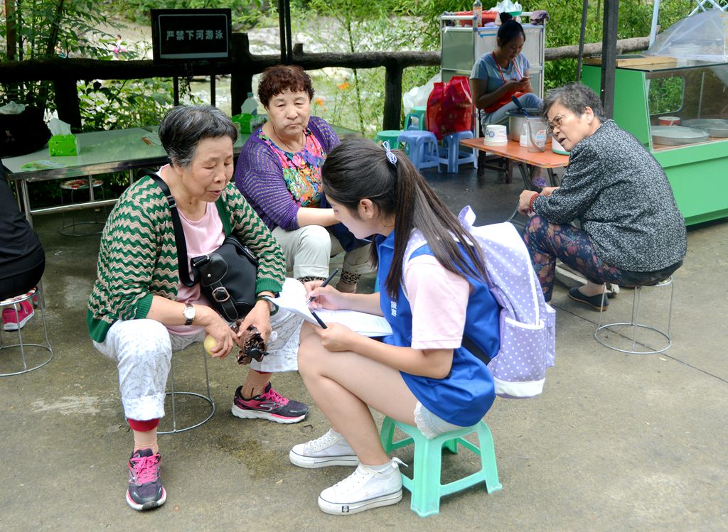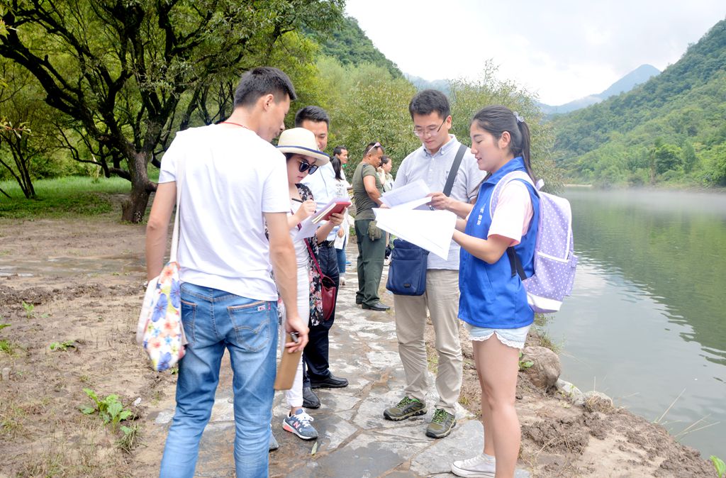 一路上,沿途青山绿水,鸟啼蝉鸣,时晴时雨,山间云雾缭绕,溪水潺潺,各色景点点缀其间,康县生态旅游走廊带给队员们强烈的震撼。但行驶在雨季的傍山环路上,九曲回环,山路十八弯,路边不时出现的落石和滑坡场景也给旅途增加了一丝惊险。经过两个多小时长途跋涉,小分队终于到达阳坝景区。景区风景如画,空气清新,沁人心脾,舟车劳顿顷刻全无,不愧是“天然氧吧”、“甘肃西双版纳”。由于时间有限,队员们顾不得欣赏美景便投入到紧张的调研工作中。在天鹅湖景点,队员们对景区游客进行了问卷调研,了解游客们对阳坝景区的满意度和意见建议,并向游客推荐扫码关注由公司师生参与制作的“康县旅游”微信公众号,期间还对农家乐业主们进行了深入访谈,了解了业主的经营状况和现实需求。在海棠谷景点,队员们继续对游客开展满意度调研,问卷调研过程中不时遇到游客拒绝调研或遭冷眼,但同学们都微笑应对,礼貌相待。