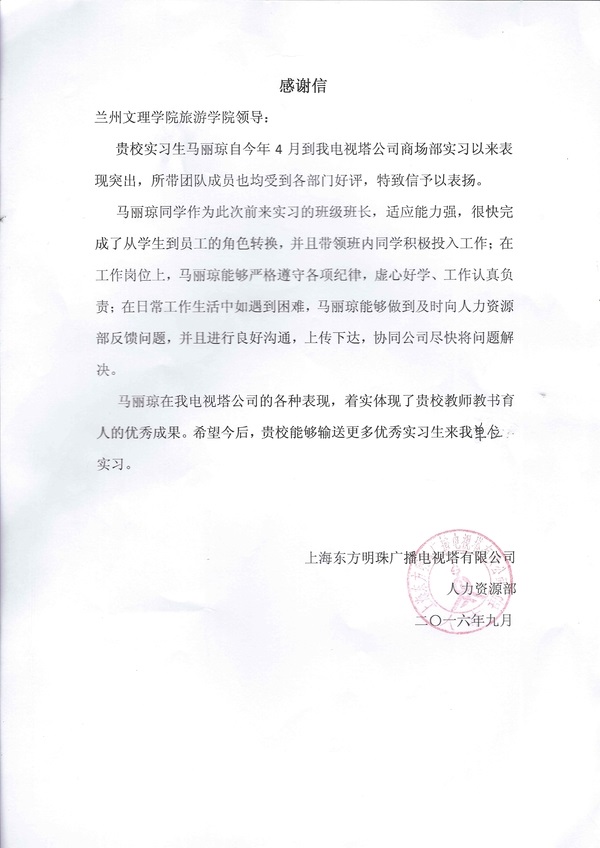 近日,懂球体育收到来自上海东方明珠广播电视塔有限公司的感谢信,信中对以马丽琼同学为代表的懂球体育14级景区开发与管理专业15名实习生表示高度赞赏。