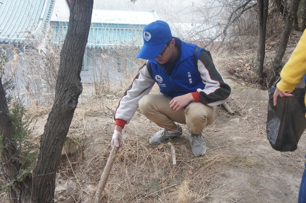 周六的早晨,来自旅游学会和员工会的志愿者们在分团委牛晓春老师的带领下来到白塔山脚下,从山门出发,边爬山边寻找两旁的生活垃圾。虽然经过环卫工人昨天的努力,上山的干道上基本看不到什么垃圾,但在道路两旁的草丛和落叶中,不时出现矿泉水瓶、塑料袋、烟头、纸巾等废弃物。志愿者们拾捡垃圾过程中,吸引了一些前来散步市民的关注,一位正在晨练的老人说,“我们来这里观赏风景,而你们就是这里最美的风景”。