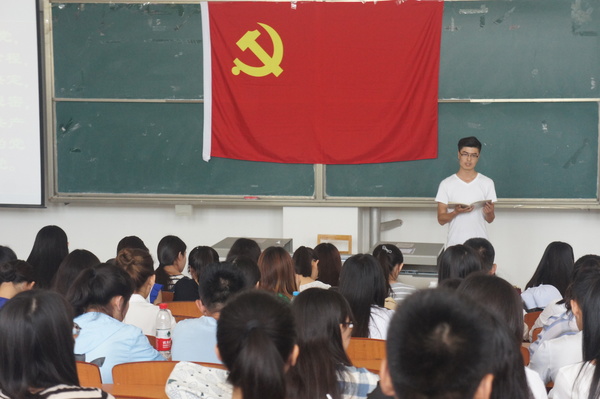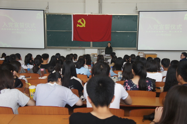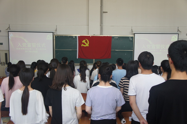 仪式在慷慨激昂的国际歌声中拉开帷幕,在领誓人王金东同学的带领下, 全体预备党员面向鲜红的党旗,举起右拳庄严宣誓。参加宣誓的预备党员代表王金东同学发表了感言,向党组织承诺努力做一名合格的共产党员。
