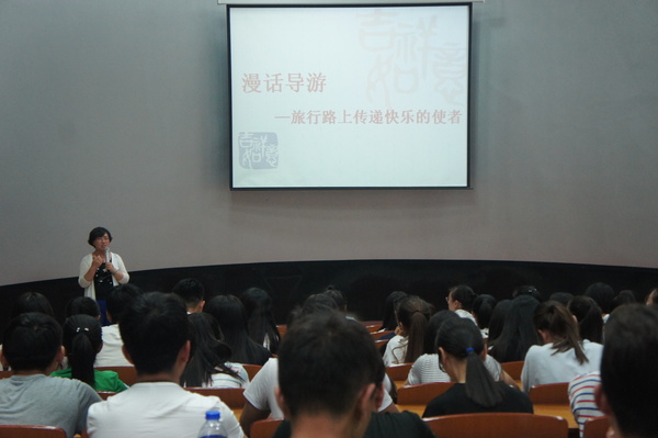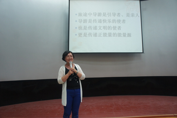 潘静老师的讲座从“旅途中导游是引导者、是亲人”,“导游是传递快乐的使者”,“导游是旅游文明的使者”以及“导游是传递正能量的能量源”这四个方面阐述了导游工作的性质。她指出,导游工作者要学会表扬游客,善于发现对方优点,给大家传递快乐;导游人员要把握游客心理,讲解必须有带入性,与游客产生互动。潘静老师以《濒临崩溃的生活》这部电影为例生动形象的讲解了导游的讲解方式和技巧。她还表示,导游人员不仅是为游客服务,更要对游客负责,让游客在参观景点的过程中能学到更多有益的知识;导游是一份看似简单但充满挑战的职业,而一名“好导游”必须耐得住寂寞、守得住底线、扛得住挫折、静得下心来学习。
