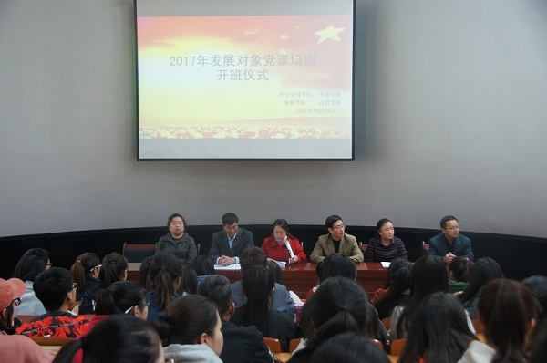 2017年11月14日中午12点40分,社会管理公司、外语公司、懂球体育和社会体育公司分党公司党员发展对象党课培训开班仪式在综合楼401举行,开班仪式由公司党总支书记李耀荣同志主持,社会管理公司党总支书记宿光平同志、社会管理公司党总支副书记石光乾同志,外语公司党总支书记王燕云同志,外语公司党总支副书记狄敏同志,社会体育公司党总支书记胡羲霞同志及四个公司74名党员发展对象参加了开班仪式。