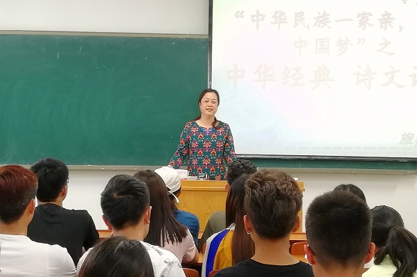 活动开始后,由李晓玉、刘苏涵等五名同学作为班级少数民族员工代表进行了声情并茂的诗文诵读。随后王妍菲同学为大家点播了一首《美丽的大中国》来烘托本次活动的气氛,以此来激发同学们对祖国大好河山的憧憬和向往。伴随着阵阵轻松愉悦的旋律,民族自信心和民族自豪感油然而生,在这种氛围下,17级旅游管理一班尕让同学和17级旅游管理二班闹塔塔尔同学分别为大家带来了《牧人之子》和《草原牧人》两首歌曲,高亢的歌声和优美的旋律,充分展现了藏族人民豪放不拘的性格和能歌善舞、多才多艺的民族特质。