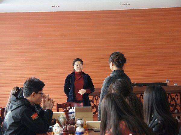 培训开始前,徐老师亲切的和学员们做了互动,学员们表现出很高的学习积极性。接着,徐老师从站姿上为学员们进行讲解,提出头悬梁、肩放平、收腹、调整呼吸、五指并拢、手放肚脐处、小八字步、眼睛向前看、微笑等九点要求。之后,徐老师介绍了手操,提出一慢二看三转四介绍这四点要求,并示范了手操的每个动作要领,耐心的为每位学员纠正不足。徐老师用手操的方式讲述了茶艺的精髓以及茶艺基本的礼仪,每位学员都认真听讲并完成规定的动作,获得老师的称赞与好评。最后,徐老师希望每位学员能在以后的生活中多加练习茶艺礼仪,从生活中领悟茶艺礼仪的内涵。