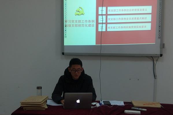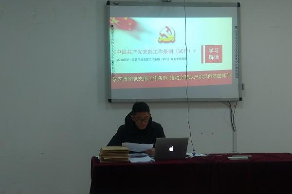 常老师逐章重点解读介绍了十九大以来开展学习党支部工作条例的相关背景,《中国共产党支部工作条例(试行)》的出台体现了中国共产党持之以恒推进全面从严治党的坚定决心以及把党支部建成坚强战斗堡垒的主张。《中国共产党支部条例(试行)》包含总则、组织设置、基本任务、工作机制、组织生活、党支部委员会建设、领导保障、附则八章。其中总则包含《条例》制定背景、党支部职能、党支部工作需遵循的原则三部分。常老师认为,学习《中国共产党支部条例(试行)》不应该停留在理论上,更应该以实际行动去践行条例的要求,时刻严格规范自己的一言一行。最后,常老师强调《中国共产党支部条例(试行)》制定和实施是推动全面从严治党向基层延伸的重要举措,为新时代党支部建设提供了基本遵循。加强了党的组织体系建设,对巩固党的长期执政的组织基础具有重大意义和深远影响。