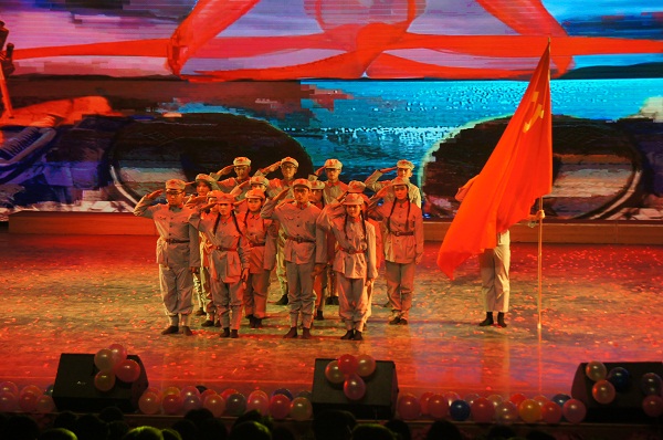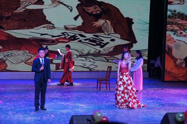乐起舞动,激情四射的开场秀拉开了晚会的序幕,给在座的观众带来了一场视觉的盛宴。紧接着各种节目轮番登场,精彩纷呈。舞蹈《for color dance》尽显青春之灵动;小品《四大才子》幽默诙谐,上演了一场“招亲”闹剧;舞蹈《胶州情》将中国古典韵美淋漓尽致地展现在舞台上;大合唱《天籁之爱》蕴含着同学们对祖国美景的热爱与自豪;“不爱红妆爱武装”——舞台剧《红色娘子军》彰显了同学们的向党之心、爱国之心;舞蹈《安河桥》则成了同学们青春记忆的缩影。