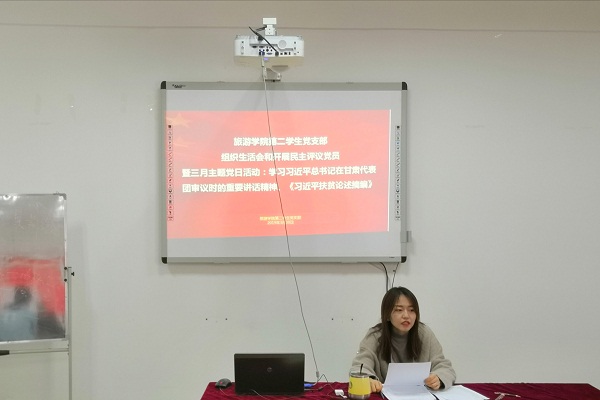 首先进行三月主题党日活动。刘璐老师提到了习近平总书记在甘肃代表团审议时的重要讲话中的核心问题——脱贫。习近平总书记专门对甘肃的脱贫攻坚工作发表重要讲话、做出明确指示,为我们指明了前进和努力的方向,极大地增强了我们打赢打好脱贫攻坚战的坚定决心和必胜信念。她强调领导要学习习近平总书记的“四要”:要咬定目标不放松,要整治问题不手软,要落实责任不松劲,要转变作风不懈怠。这四个“要”既是对坚定必胜信心的明确表示,也是对脱贫进程、脱贫“成色”的具体要求。随后,刘老师又点明了《习近平扶贫论述摘编》中八个坚持:坚决脱贫攻坚,共享全面小康;坚持党的领导,强化组织保证;坚持精准方略,提高脱贫实效;坚持加大投入,强化资金支持;坚持社会动员,凝聚各方力量;坚持从严要求,促进真抓实干;坚持群众主体,激发内生动力;携手消除贫困,共建人类命运共同体。她表示,做好八个坚持,也就更加明确了扶贫的重要性以及政府对扶贫工作的重视。