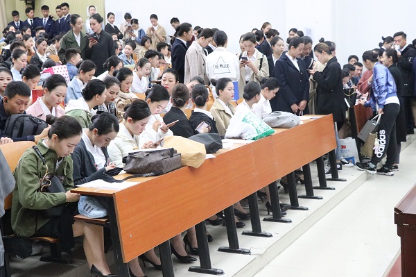 招聘会开始前,工作人员播放了报名面试须知,让前来参加面试的空乘专业人员了解报名途径以及面试流程。招聘会开始后工作人员对面试人员的着装、妆容、学历等作出了要求,并对相关证件进行检查。在工作人员以及公司员工会干事的积极配合下,招聘会会迅速有序的展开了。在现场,空乘专业人员身着空乘制服,举止大方优雅,体现出他们高超的专业素养以及对本次招聘会的重视。