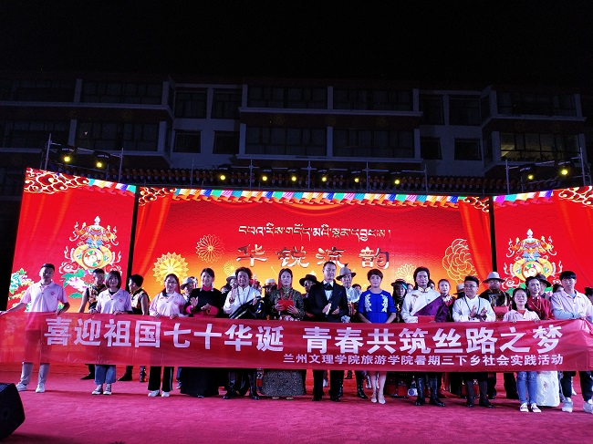 晚上7:00实践团队应天堂村人民邀请观看了由天祝县融媒体中心主办的庆祝建国70周年“民族团结杯”首届华锐民歌大赛及颁奖晚会,本次晚会也正值天祝县建县70周年,因此吸引了很多省内外著名民歌歌手前来参赛并受到了甘肃省电视台、青海省电视台及天祝县电视台的广泛关注,活动结束以后实践团队与天祝县县长、天堂镇镇长及所有参会人员作合影留念,至此第二天行程任务圆满完成。