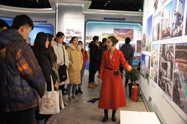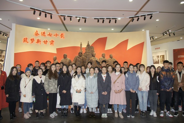 甘肃省经济社会发展展览馆位于兰州新区经九路以西、纬五路以南,总投资约2.5亿元,总建筑面积20390平米,总展示面积约10050平米,馆内地下1层,地上3层。展馆内包含序厅、自然人文馆、发展成就馆、功能休闲区和主题成果展区等多个展区,各展览区以充实的资料,丰富的图片、文字、实物、视频和VR体验等多种手段和技术,全面展示、全景呈现甘肃省经济社会发展的巨大成就、特色亮点和创新实践。展览馆也将成为展示甘肃省经济社会发展成就、自然人文风貌和历史文化底蕴的又一个重要形象窗口。通过讲解员的讲解,我们了解到,展馆以“奋进七十载,筑梦新甘肃”为主题,全面总结了新中国成立70年以来,陇原儿女在党中央的领导下,砥砺奋进、不断超越,坚决打赢脱贫攻坚战、推动高质量发展、保护好西部生态屏障等事业中创造出令人惊叹的甘肃成就。展馆内的展出深深感染着每一位参观的同学,大家不时驻足观看,真切地感受到甘肃人民以“人一之、我十之,人十之、我百之”的甘肃精神艰苦奋斗,锐意进取,使陇原大地发生翻天覆地的变化。