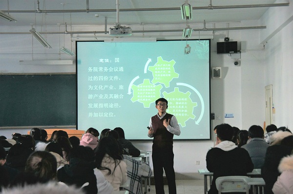 讲座开始,常老师先给同学们播放了《绚丽甘肃》纪录片,展示了甘肃文化与旅游的深度融合,并以此为切入点循序渐进,由浅及深地对文化和旅游深度融合发展进行了讲述。首先,常老师通过解读中央文件,阐述了推动文化和旅游深度融合发展的重大意义。常老师从基本知识入手,给同学们讲了文化、旅游、旅游文化和文化旅游的基本概念与定义。常老师提出,文化是旅游的灵魂,旅游是文化的重要载体,没有文化的旅游没有魅力,没有旅游的文化没有活力,在未来发展中,我国旅游业将进入“旅游+产业”深度融合的阶段,旅游形式将由单一的观光游览形式转变为观光、休闲、度假、康体、研修等多种元素并重的旅游形式。接着,常老师针对如何深化文化和旅游的融合提出了自己的观点:一、要创新资源优势,以包容的精神学习吸收各领域的优秀文化,拓宽旅游资源开发新思路;二、要创新产品模式,加大对文化旅游创意策划,开拓旅游产业和文化产业的新业态;三、要创新人才培养,提升旅游从业人员的政治素质和文化素养,培养符合旅游产业和文化产业融合发展需要的复合型人才;四、要创新机制体质;五、要创新市场发展格局。最后,常老师列举了“迪士尼”、“旅游演艺”、“创意园区”等旅游和文化深度融合的案例来证实文旅融合的重要性。