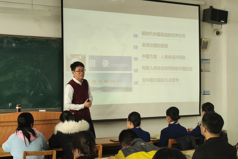 此次授课,常老师以人类命运共同体的思想为中心展开五个方面的阐述,分别为:新时代中国面临的世界形势;全球治理的困境;中国方案:人类命运共同体;构建人类命运共同体的中国贡献;对中国方案的几点思考。这五个方面充分展示了当下世界经济机遇与挑战并存的重要形势,并因此统领着全球发展的步伐,新时代下的中国面将会遇到更严重的危机,面临更严峻的挑战,这使中国站在机遇与挑战并存的十字路口,而中国在全球经济乏力时秉持共商、共建、共享的全球治理观去深度参与治理全球事务,积极引导国际秩序的发展变革,在构建人类命运共同体中加强党的统一领导,让人类命运共同体能够深入人心,更好地贯彻落实于每个人的心中。常老师就习近平就任总书记后首次会见外国人士时发表的演讲,表示国际社会日益成为一个你中有我、我中有你的“命运共同体”,面对世界经济的复杂形势和全球性问题,任何国家都不可能独善其身。“命运共同体”是中国政府反复强调的关于人类社会的新理念。他指出,推动建设人类命运共同体,是中国领导人基于对世界大势的准确把握而贡献的“中国方案”。人类只有一个地球,各国共处一个世界。经济全球化让“地球村”越来越小,社会信息化让世界越来越平。国家之间,不能只追求你少我多、损人利己,更不能搞你输我赢、一家通吃。只有义利兼顾才能义利兼得,只有义利平衡才能义利共赢。