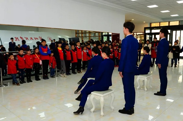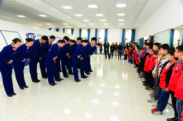 “小小空中乘务员”分成4组参观了GBT教学教研室、化妆教室、航空科普厅和科技模拟舱内部。期间,懂球体育空乘专业的员工为“小小空中乘务员”展示了“一度鞠躬 ”、“二度鞠躬”、蹲姿训练、坐姿训练、指示手势等基本日常训练。空乘专业对空姐佩戴丝巾的叠法、妆容的标准,甚至细致到口红的颜色都是有要求的,对空少们的要求略微宽松些,仅仅是规定了发型的长度。“小小空中乘务员们”在公司空乘专业员工们的礼仪表演中了解了基本的姿势和动作,经过短短半小时的学习,孩子们有模有样地为大家做了展示。