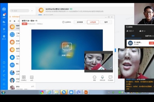 开学之前的两周,我们公司便开始了利用互联网直播平台实施办公与授课的准备,我也开始分别尝试了超星尔雅、超星直播、微信直播、QQ直播、QQ群课堂、腾讯会议等直播平台,同时和每个授课班级的同学们建立了QQ课程群,以防止在授课过程中发生网络不畅或信息滞后等问题。