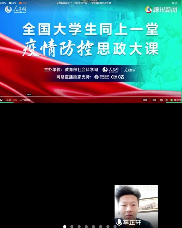 最后进行了全国思政大课堂学习后的感悟大讨论,员工党员同志在会上认真发言、积极讨论、相互学习。员工党员纷纷表示,将自觉发挥党员模范带头作用,用实际行动诠释一名共产党员的担当。通过微信群、QQ群等网络平台积极与其他同学联系,号召大家听从指挥,做好防护,不信谣、不传谣,不提前返校,按时参加线上教学活动,积极参与线上教学互动,认真完成老师布置的各项教学任务,为打赢疫情阻击战贡献力量。