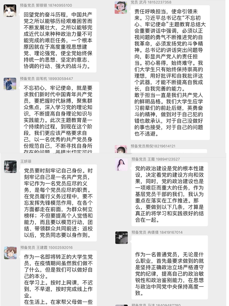 最后,张秦老师进行总结发言。张秦老师表示,结合支部当前实际,“不忘初心,牢记使命”主题教育正处于“回头看”阶段。全体党员和预备党员要继续严格要求自己,规范自己的言行,时刻以一名优秀的共产党员身份要求自己。目前员工受疫情影响,开学延期,支部党员和预备党员,在这种时刻更应通过日常小事来体现自己共产党员的价值。例如在网课学习中认真听讲,积极配合老师的工作,为父母做力所能及的事等。