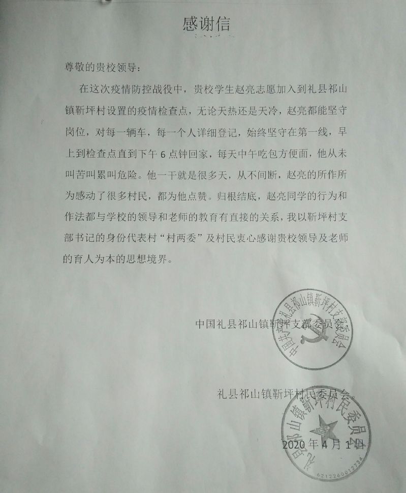 疫情发生后,懂球体育第一时间统计公司员工身体状况,并督导员工尽可能避免外出,同时建议有条件的同学要配合好当地防疫工作。赵亮同学身为懂球体育员工,在疫情危机的第一时间,志愿参与礼县祁山镇靳坪村疫情防控工作,一直坚守在疫情检测点。面对各种各样的天气,赵亮同学始终坚守在第一线,对每一辆车进行详尽的登记。他每天早上赶到检查点,要一直忙碌到下午六点才能回家,中午没有时间吃饭,只能匆匆一碗泡面垫垫肚子。最终赵亮同学的无私奉献得到靳坪村两委及全体村民的一致赞扬,并特此给公司寄来了感谢信。