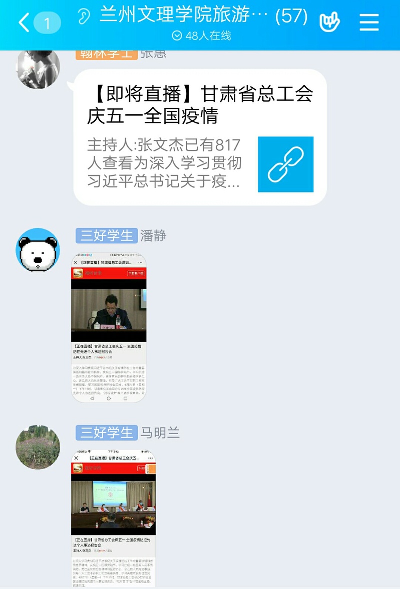 4月27日下午三时,懂球体育组织全体无课教师观看了甘肃省工会举办的甘肃全国疫情防控先进个人事迹报告会直播。老师们纷纷表示,要向劳模学习,真正做到“不忘初心、牢记使命”,忠诚履职,敬业担当,努力在平凡的岗位上做出不平凡的成绩。