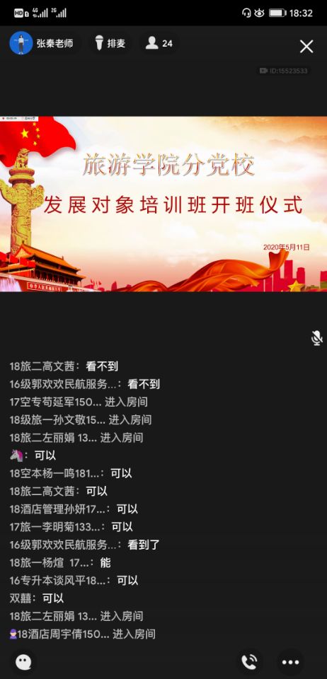 首先,由张秦老师为大家介绍了党课培训计划、相关纪律规定以及今后党课活动的安排。虽然是在线上上党课,但张秦老师希望大家仍然能够严格遵守培训纪律、不迟到、不旷课,端正入党态度,认真对待每一次的党课培训。接着,由谈风平同学代表全体党员发展对象发言,他结合当下疫情谈了谈自己的感受,并表示作为党员发展对象,要以身作则,进门勤洗手、出门戴口罩,在校期间,配合好老师和公司的工作,遵守公司和公司的规定。