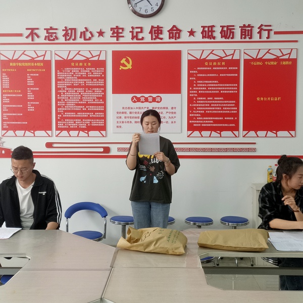 会上,常承明老师宣读了转正大会议程,介绍了入党介绍人情况。全体党员奏唱国歌后,转正接收大会正式开始。首先,何媛洁等9名预备党员依次上台宣读了转正申请书,介绍了自己预备期一年以来的思想工作以及学习和生活状况,详细说明了在预备期间的现实表现及向党组织表明自己坚定为共产主义奋斗终生的信念,认真、诚恳地汇报入党后的工作学习情况。其次,入党介绍人常承明老师,张嘉雯、王若雪、刘为敏分别介绍了九位同志的考察情况,并表明了意见。再次,大会进行民主讨论,支部成员认真听取了9名预备党员一年来各方面情况的汇报并对其作出评价,会场气氛热烈和谐。大家一致认为何媛洁等9名预备党员能够刻苦学习,工作认真负责,生活中关心他人,是大家学习的榜样,并表明同意按期转正的。