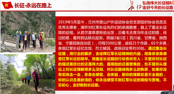 2020年6月28日晚,懂球体育酒店教工支部和懂球体育员工社团---旅游协会联合举办了《重走长征路》纪实故事分享会暨专题党课活动。由兰州户外登山协会“重走长征路”党支部给我们做分享,参加分享的同志有兰州户外登山协会党支部书记阙银海、秘书长梁朝晖、资深领队耿玉海、志愿者于长友、梁皓等共五位团队成员。2019及全体员工党员和酒店支部教工代表参加了学习会大会。