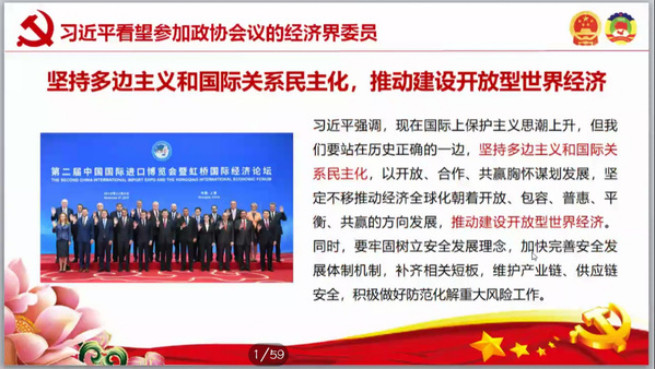 课程开始后,雷经理就全国政协十三届三次会议及十三届全国人大三次会议的召开背景和重大意义作了简要阐述。雷经理认为,全国两会是在疫情防控常态化的特殊背景下召开的,防疫工作彰显了中国共产党领导和我国社会主义制度、我国国家治理体系的强大生命力和显著优越性。