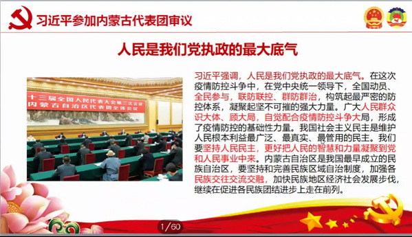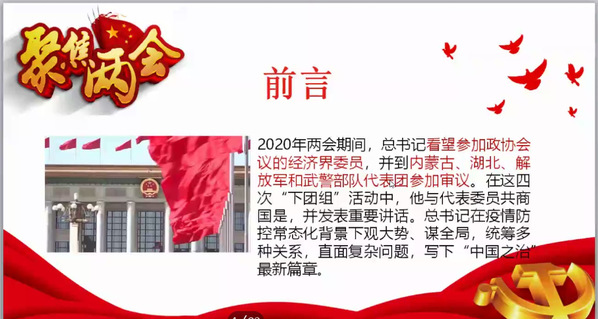 接着,雷经理正式开始本节课内容。第一、习近平参加内蒙古代表团审议,并提出期望,希望内蒙古同志能弘扬“蒙古马精神”,各级政府能坚决贯彻党中央决策部署,坚持人民在上、不断造福人民、把以人民为中心的发展思想落实到各项实际工作之中;第二,习近平看望参加政协会议的经济界委员。他强调,在疫情防控常态化的特殊背景下,要坚持用全面辩证长远的眼光分析经济形势,把握发展大势,利用好社会主义基本经济制度的优越性,解放和发展社会主义生产力,不断实现共同富裕;各地区各部门强化责任担当,抓好中共中央决策部署和政策措施落实,努力克服新冠疫情带来的不利影响;坚持多边主义和国际关系民主化,建设开放型世界经济体系;第三、习近平参加湖北代表团审议。他指出,政府应整体谋划系统、重塑全面提升,织牢织密公共卫生防护网,改革疾病预防控制体系,提升疫情监测预警和应急作用;第四、习近平出席解放军和武警部队代表团全体会议,他提出,党要持续推进国防和军队改革,在常态化疫情防控工作中扎实推进军队各项重要工作的落实,坚决实现国防和军队建设2020年目标任务。