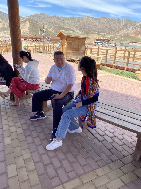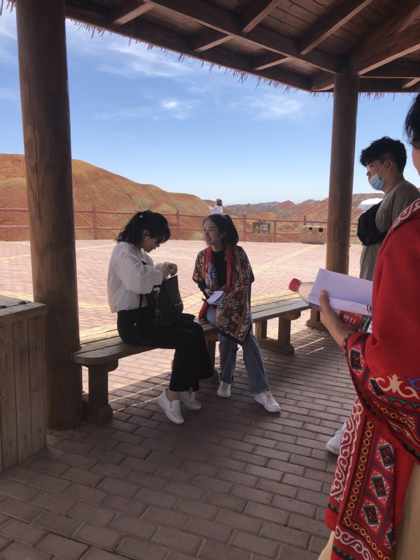 2020年7月19日早八点,由魏欣老师带领暑期实践团队在乘车一小时后到达第三站目的地—张掖七彩丹霞地貌地质公园。进入景区前,通过和负责人的交谈发现该景区的人员管理体制较为详细、严格,意在为游客提供最优质的服务和感受。景区内,张掖七彩丹霞地貌共有7个观景台:1号七彩仙缘台,色彩较淡,日出时可观奇景;2号七彩云海台,主要可看到扇贝形状和众僧拜佛的七彩山地丘陵,在这里也可以体验直升机;3号观景台七彩屏,在国家地理杂志上用的就是此处景色,十分绚丽多彩;4号七彩虹霞台,在日落的时候可看到刀山火海景观以及赤壁长城,丝绸天路等景观;5号七彩锦绣台,日出时有些逆光,在此处里可看到五花肉景观;另6、7号观景台正在开发中。