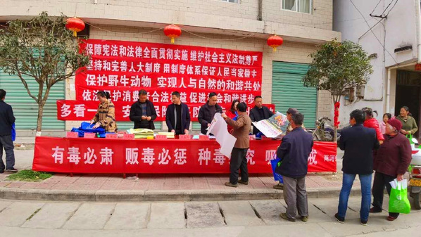 图为禁毒宣传队成员和实践团队成员周敏于两河镇中街通过悬挂横幅、咨询服务、发放禁毒宣传资料等方式,对来往群众普及毒品知识和相关法律法规。周敏摄