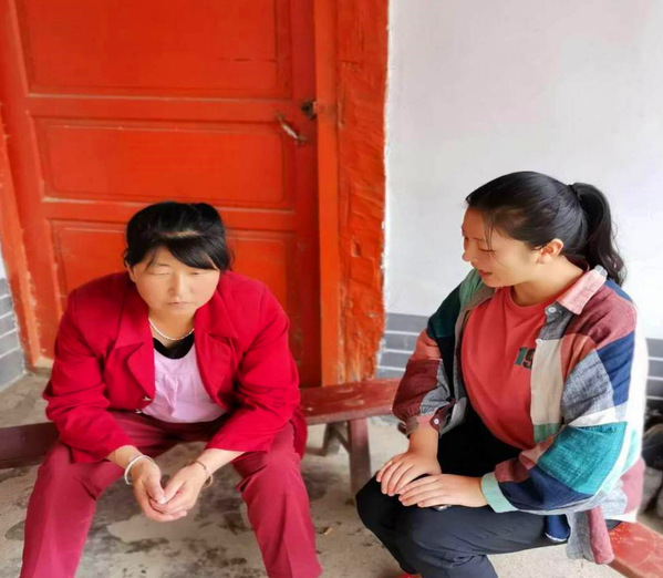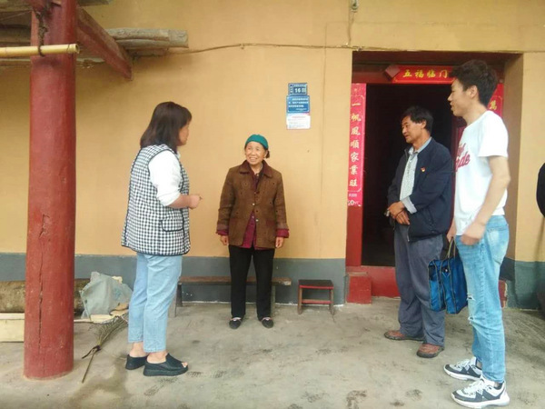 图为实践团队成员周敏跟随禁毒宣传队走访廖坝村留守老人,并进行毒品知识普及。周敏摄