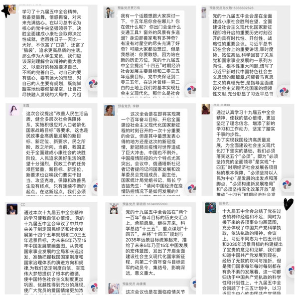 本次学习研讨会分三部分举行。首先张秦老师对十九届五中全重要讲话做了简单介绍,她提到:习近平总书记的重要讲话,高瞻远瞩、总揽全局,思想深邃、内涵丰富,鼓舞人心、催人奋进,为做好“十四五”时期各项工作、全面建设社会主义现代化国家指明了前进方向,提供了根本遵循。并且希望党支部成员可以认真完成学习强国的任务,主动学习十九届五中全会的精神,不断提高自己的党性修养。随后,党支部组织全体成员通过线上聊天的形式,分享了关于十九届五中全会的学习感悟。支部成员纷纷表示,作为一名老员工党员,全会的精神使他们印象深刻,受到了极大的触动。通过学习十九届五中全会精神,大家都坚信我国的经济发展水平一定会呈现出一个稳步上升的态势,在国际社会中的地位也将会不断上升,综合国力更会逐步加强。并且希望我们每一位同志都能为早日实现社会主义现代化及民族复兴贡献自己的力量。最后,张秦老师对本次会议做出了总结。大家对十九届五中全会精神都有了自己的认识与见解,希望支部党员牢记党员义务,积极承担社会责任,在这个特殊的时期,决胜的时刻,尽全力奉献出自己的一份力量。
