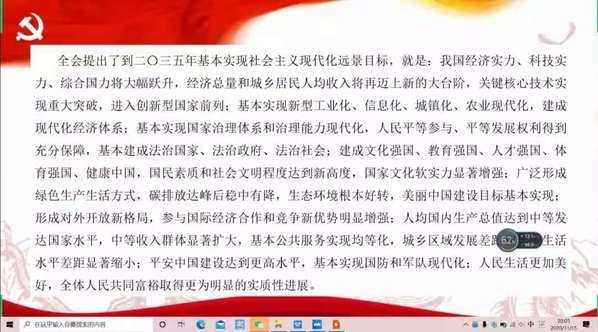 本次会议精神的研讨学习,由三部分组成。首先由徐小霞同志带领支部成员学习十九届五中全会精神,并做了简要介绍。全面总结了“十三五”以来的巨大成就和发展经验,深刻分析面临的国际国内形势和风险挑战,提出了“十四五”时期我国经济社会发展的指导思想、必须遵循的原则和主要目标,对开启全面建设社会主义现代化国家新征程提出了明确要求,为坚持和发展中国特色社会主义、实现“两个一百年”奋斗目标、实现中华民族伟大复兴的中国梦提供了方向指引和根本遵循。