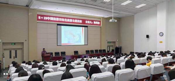 陶雪松教授宣讲了主题为《甘肃省红色旅游及经典景区研学》的讲座,首先陶教授带领大家一起朗读了《游天台山记》中的一段话,提到中国旅游日形象口号是“爱旅游,爱生活”,接着从红色旅游概念解析、甘肃红色资源的丰富内涵和时代价值、甘肃的国家红色旅游经典景区研学三个大的方面展开讲述,其中讲到,红色旅游的内容体系经过了三个阶段的发展和延伸,红色遗址遗迹数量众多,覆盖面广,并详细介绍了甘肃省的16个红色旅游景区及其背景。之后就如何更好的打造红色旅游景区、乡村提出了针对性的建议。最后,陶教授和在场人员热情的朗读《七律·长征》后,大家合影留念,本次5·19中国旅游日红色旅游主题讲座圆满结束。