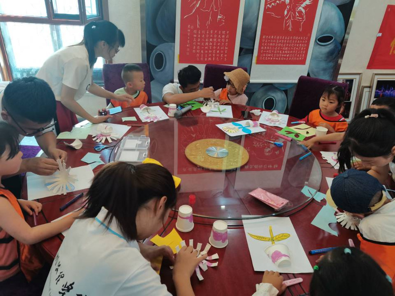 10时50分,活动小组返回老家酒楼。一楼是著名剪纸大师杨荣祖老师的作品展示基地,领队白伟宏带领大家参观并讲解。剪纸传承赓续的视觉形象和造型格式,蕴涵了丰富的文化历史信息,表达了广大民众的社会认知 、道德观念、实践经验、生活理想和审美情趣,具有认知、教化、表意、抒情、娱乐、交往等多重社会价值。为了让小朋友们认识到剪纸对于中华民族、对于中国的特殊意义,明白其在中国人民心中的重要地位,激发小朋友们对于剪纸的兴趣,实践团队精心策划了课程《向日葵剪纸创意》,带领小朋友们自己动手制作手工,一次性的纸杯变成立体的向日葵花朵和花盆,涂色和装饰后,可爱的向日葵跃然纸上。老师们引导小朋友将自己的手工作业送给爸爸妈妈作为礼物,活动的最后全体队员和小朋友们合影留念。