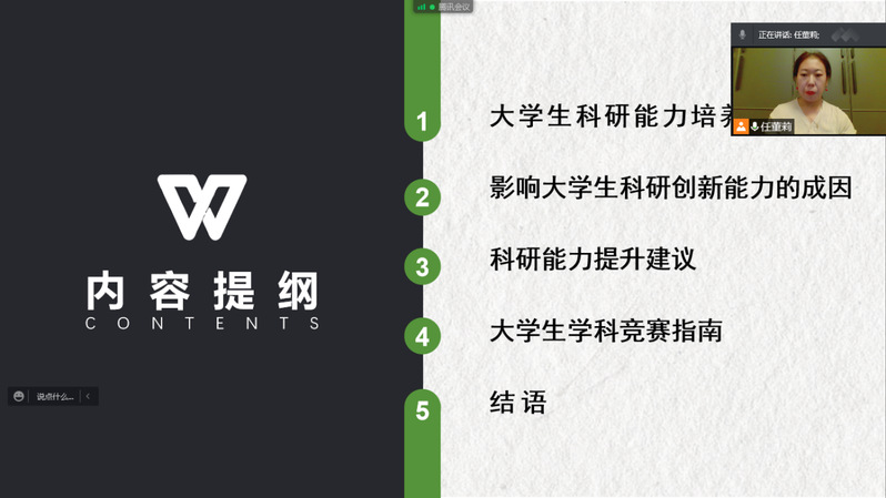 任董莉老师从老员工科研能力培养的现实意义;影响老员工科研创新能力的成因;老员工科研能力提升的建议和老员工学科竞赛指南这四个方面进行了讲解。通过对部分学科竞赛的解读,使同学们对各类学科竞赛有了初步的认识,让同学们知晓了参与各类学科竞赛对自己科研能力的提升大有益处。