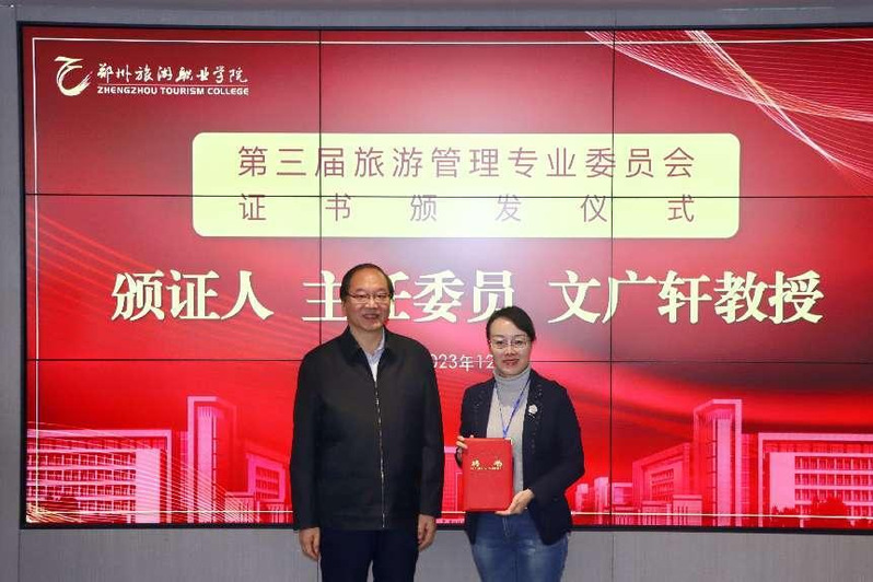 旅游管理专业委员会主任委员、郑州旅游职业公司经理文广轩教授宣读了旅游管理专业指导委员会成立文件,并为专委会副主任委员、办公室主任、委员颁发聘书。