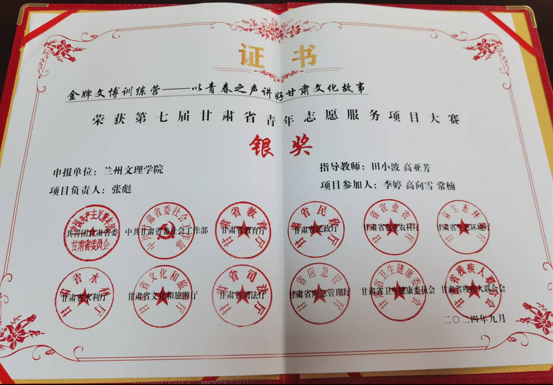 9月1日第七届甘肃省青年志愿服务项目大赛和首届公益创新赛决赛在兰州财经大学举行。在本次比赛中高亚芳教授和田小波副教授指导的“金牌文博讲解员训练营——以青春之力讲好甘肃文化故事”服务项目荣获大赛银奖。