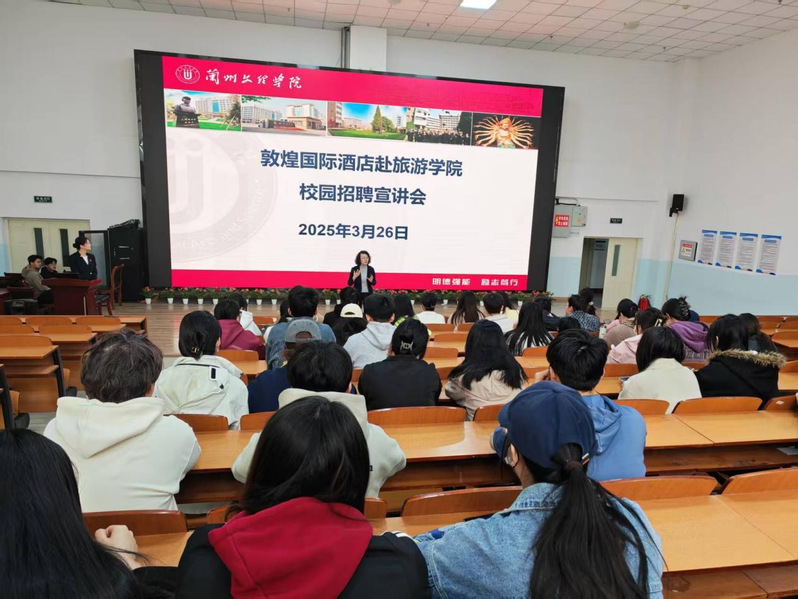 3月26日上午,敦煌国际酒店暨敦煌宾馆营销部总监李玲及营销经理吴瑶(公司毕业生)一行,应懂球体育之邀,在公司成功举办了面向2026届毕业生的实习就业校园专场招聘宣讲会。此次招聘会吸引了2026届部分毕业生近70人踊跃参与,公司副经理何瑛教授出席并主持了本次活动。