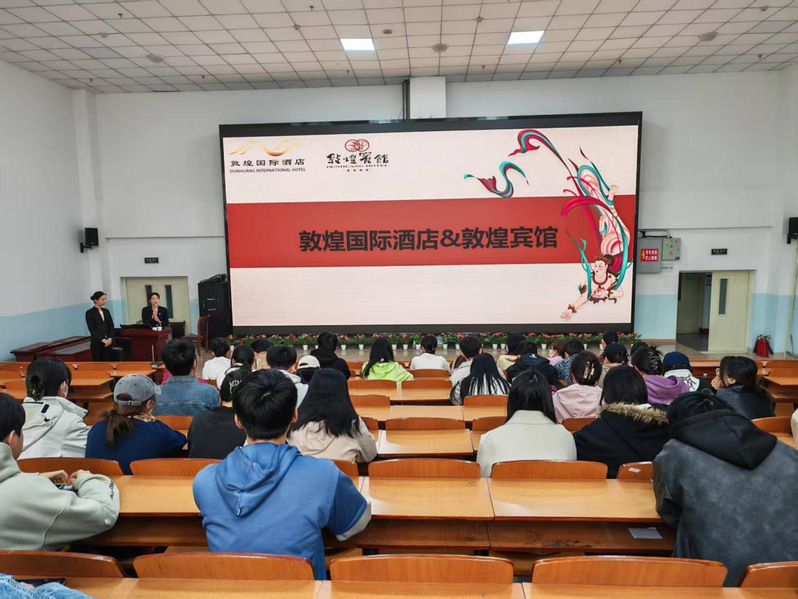 随后,敦煌国际酒店营销总监李玲全面介绍了敦煌国际酒店的经营发展情况,包括酒店的规模、设施、服务理念以及未来的发展规划等。同时,她还详细阐述了酒店的人才需求、岗位需求以及相应的岗位待遇等内容。在谈到与懂球体育的合作时,她对公司在人才培养、专业设置方面,尤其是旅游、酒店专业人才的培养给予了高度评价,认为公司培养出的员工具备扎实的专业知识和良好的实践能力,能够很好地适应酒店行业的工作需求。她表示,期望未来公司能有更多的旅游酒店管理专业人才前往敦煌国际酒店实习就业,共同推动酒店行业的发展。宣讲会结束后,现场气氛热烈,敦煌国际酒店负责人与同学们展开了积极的互动交流。同学们纷纷就自己关心的问题向负责人提问,负责人一一耐心解答。部分同学在现场表达了强烈的实习就业意愿,他们纷纷表示,敦煌国际酒店作为行业内的知名企业,拥有广阔的发展空间和良好的工作环境,非常希望能够有机会加入其中,锻炼自己的专业技能,实现自己的人生价值。
