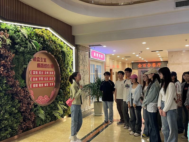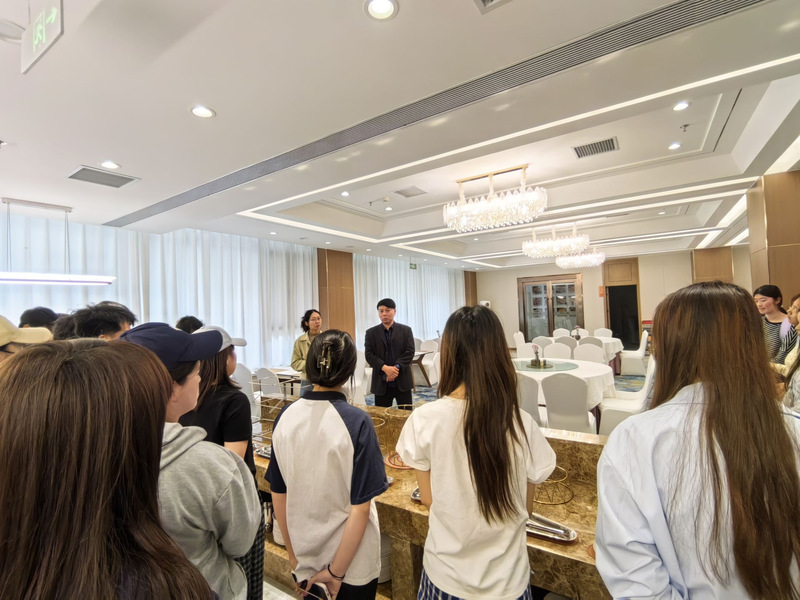 在张兴的引导下,学生们首先参观了宾馆七楼的客房部。张兴结合宾馆智能化设施(如客房智能语音助手“小度”)、标准化服务流程和房间布局动线设计,详细讲解了客房清洁、设备维护等核心环节。随后,员工们移步至一楼自助餐厅。张兴以餐厅布局设计和菜品供应链管理为重点,分享了宾馆在餐饮服务中的创新实践。员工们通过观察各楼层宴会厅布局设计,进一步将课堂理论与行业实际相结合。
