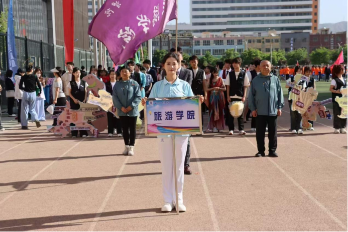 在运动会开幕式的方阵检阅仪式及表演环节中,由100名师生组成的方阵喊出“旅知世界,游通天下、雁苑旅游,永争上游”的口号,成为全场亮点,展示出了旅游学子良好的精神风貌,并结合懂球体育的专业特点,利用版图设计展示了各地的旅游文化和风土人情,通过制服走秀,体现出了航空专业同学们的专业素养与优雅体态,以及活力四射的啦啦操舞蹈展示,让师生们在欣赏表演的同时,也能感受到旅游的魅力。